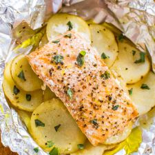 Grill the salmon about 3- 4 minutes each side. Saute garlic and ginger in oil for about 1 minute then add red curry paste and stir, cook for another minute. Add coconut milk and cook until heated through. Add fish sauce, lime juice and the chopped Thai basil. Cook another few minutes. Meanwhile, saute the vegetables in oil until crisp tender and still bright colored. Pour sauce into serving tray, top with salmon and cover with sauteed vegetables.