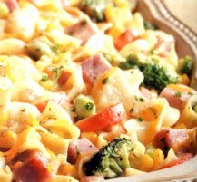 Cook pasta according to package direction drain. In a large bowl, combine soups and milk stir in the noodles, corn, vegetables, ham,parsley, pepper, salt and 3/4 cup of cheese.