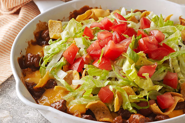 In this easy, cheesy skillet, ground beef is flavoured with onions and taco seasoning mix, then topped with corn chips, VELVEETA, lettuce and tomatoes before serving