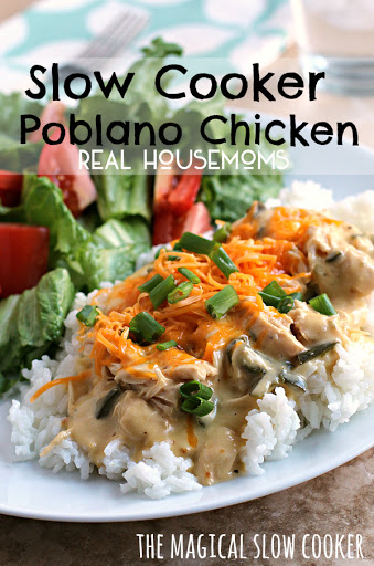 In a 6-quart slow cooker stir together the cream of chicken soup, the 3 tablespoons of water, diced Poblano peppers, green onion, garlic and pepper. Add the chicken.