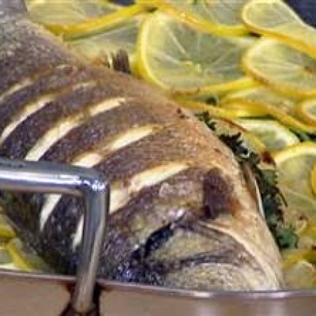 Check to see the fish is flaking from the bone. Remove roasting vegetables, herbs and lemon and use for presentation on a large platter as the center of the feast. Simple, impressive and delicious!