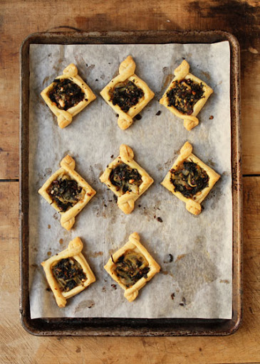 2. Preheat oven to 375° and line two baking sheets with parchment paper. Unroll both puff pastry sheets onto a floured work surface. Cut each sheet into 9 squares. Cut L-shaped slits on opposite corners of each square (creating a frame-like shape). Take hold of both corners and fold them toward the opposite side, passing one corner under the other and pressing them in place, to create a diamond-shaped pocket to hold the filling.