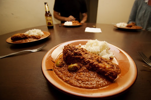 Pour off all but 1½ tablespoons of the oil and fry the tomato and chile mixture with the seasoning mixture over medium heat for 10 minutes, stirring constantly. Add the ground sesame seeds and stir until well incorporated. Return the chicken to the bubbling sauce and continue cooking over low heat, covered, for 20 minutes more.