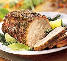 2. In a small bowl, mix together the garlic, thyme, rosemary, lemon juice, lemon zest, 1 TBS of the olive oil, salt, and pepper. Rub seasoning mixture all over pork loin. Spread remaining olive oil evenly over the bottom of a roasting pan. Place the pork in the pan.