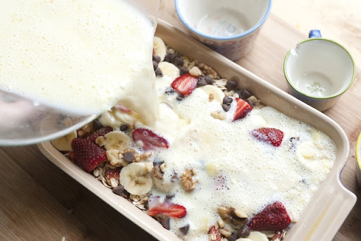 In another large bowl, whisk together the milk, egg, butter and vanilla extract. Then, pour over oats and fruit. Gently shimmy and shake the baking dish to help the milk mixture go throughout the oats.