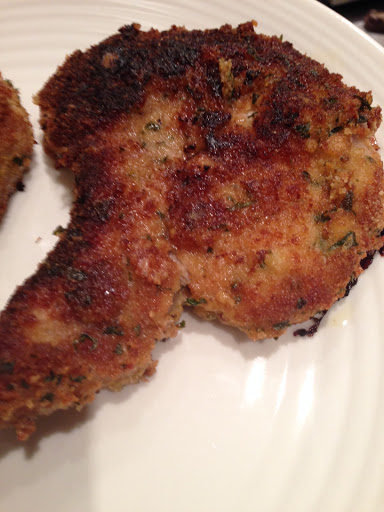 4.Dip each pork chop into the egg mixture, then into the bread crumb mixture, coating evenly. Place coated pork chops in the skillet, and brown abut 5 minutes on each side.