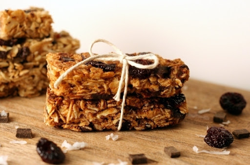 In a small saucepan, combine brown-rice syrup and brown sugar. Boil for about 5 minutes (do not allow mixture to smoke). Take off heat and add vanilla. Fold into dry mixture, being very careful since syrup will be extremely hot. Cool slightly, then fold in cherries and chocolate chips.