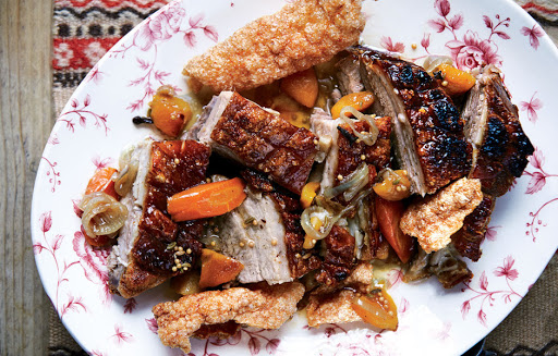Transfer pork, skin side up, to a rimmed baking sheet. Place vegetables and apricots in a large bowl; keep warm. Increase oven temperature to 475°; roast pork until skin is brown and very crisp, 25–35 minutes (the crispier, the better).