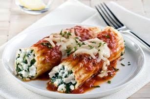 COMBINE chicken and garlic in large bowl. Add spinach, cottage cheese, egg whites and 1/4 cup mozzarella; spoon into manicotti shells.