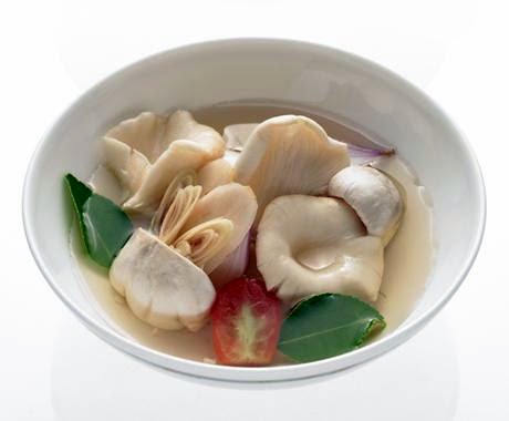 In a saucepan, bring vegetable stock, shallots, galangal, lemongrass, kaffir lime leaves and chiles to a boil. Continue to boil for 4-5 minutes. Add oyster and straw mushrooms and cherry tomatoes. Once cooked remove from heat and season with miso paste, lime juice and apple concentrate.