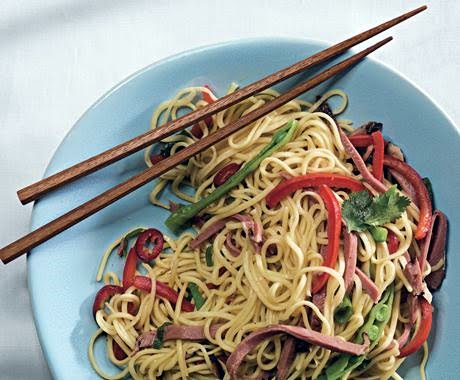 • If you live near a Chinese market, pick up barbecued or smoked duck there. Otherwise, smoked chicken or turkey from the supermarket (or leftover roast chicken) would be terrific tossed with the noodle
