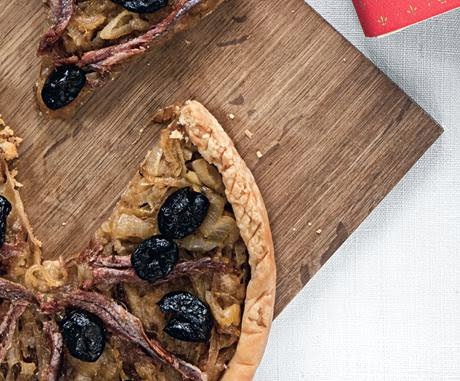 Gently run small knife around sides of pastry to loosen; carefully remove pan sides. Transfer pissaladière to platter.