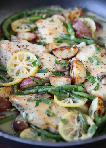 5. Combine milk and flour in a small bowl, stirring with a whisk. Add flour mixture and 3/4 cup of the chicken broth along with a sprinkle of salt and pepper to the skillet and whisk until smooth. Bring sauce to a simmer, and add beans. Simmer 2-3 minutes or until sauce starts to thicken. Add lemon slices, potatoes and mushrooms, and chicken. If sauce is too thick, add small amounts of chicken broth to thin. Reduce heat and simmer 3-4 minutes or until beans are crisp-tender. Season with additional salt and pepper to taste and then sprinkle with parsley.