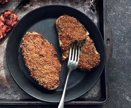 Place sesame seeds on small plate. Place half of yogurt-spice paste in shallow bowl and reserve. Spread remaining yogurt-spice paste over top of potato filling in each potato half. Sprinkle with half of sesame seeds. Dip bottom of each potato half into reserved spice paste, then dip into remaining sesame seeds. Place potatoes atop foil on grill rack above disposable pan. Cover barbecue and grill until potatoes are heated through and bubbling in center, 25 to 30 minutes. Transfer potatoes to platter and serve.