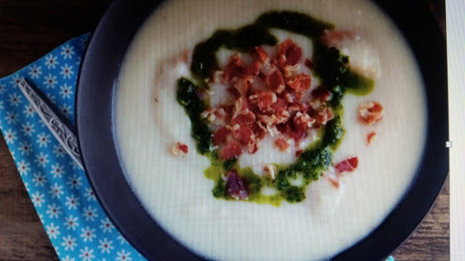 While the soup is stewing, make parsley oil by processing parsley and olive oil together in a food processor until smooth. Pour into a bowl and set aside.