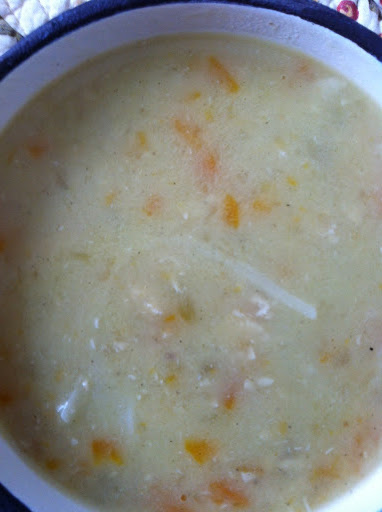 3.In a medium bowl, whisk together 1/4 cup milk with flour. When smooth whisk in remaining milk. Slowly drizzle into soup then stir thoroughly. Add chicken and simmer for 10 more minutes uncovered and serve with salad and rolls