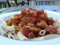 Coat a large nonstick skillet with cooking spray. Heat on medium heat. Add onion, garlic, celery, mushrooms, and oregano. Cook for 3-4 minutes. Add sausage slices and cook until browned. Drain excess fat. Add tomatoes, tomato paste, beans, and oregano. Simmer for 15 minutes. Serve with pasta of your choice.