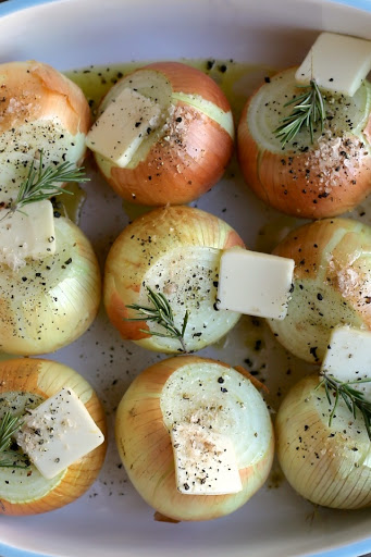 Arrange the onions in a square baking dish or a rimmed sheet pan.