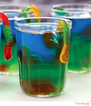 2. Prepare another Jell-O flavor, such as cherry, berry-blue, or grape. While Jell-O is cooking, place three gummy worms on top of set gelatin and let another hang over the lip. Pour second flavor over the worms, filling to the top; refrigerate