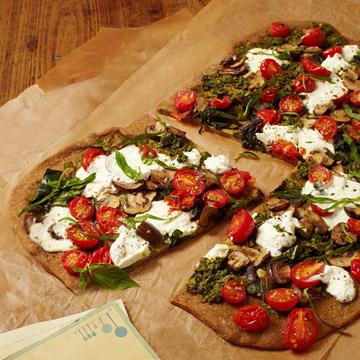 A bright green arugula pesto takes this veggie pizza over the top, complementing fresh ricotta, cherry tomatoes, cremini mushrooms and chard.