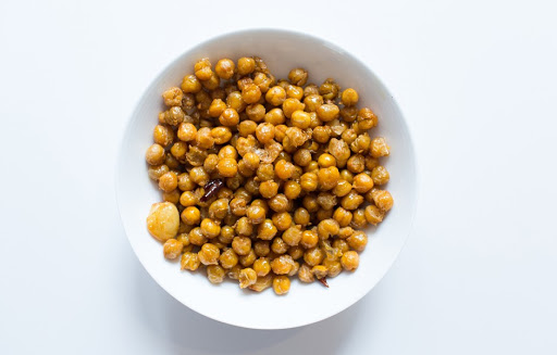 Cook chickpeas with garlic and chile in oil in a large skillet over medium-high heat until garlic is golden and chickpeas begin to blister, 6–8 minutes; season with salt and pepper.