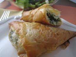 Place 1 sheet of phyllo dough flat on a work surface with the long end in front of you. Brush the dough lightly with butter and sprinkle it with a teaspoon of bread crumbs. Working quickly, slide another sheet of phyllo dough on top of the first, brush it with butter, and sprinkle lightly with bread crumbs. (Use just enough bread crumbs so the layers of phyllo don't stick together.) Pile 4 layers total on top of each other this way, brushing each with butter and sprinkling with bread crumbs. Cut the sheets of phyllo in half lengthwise. Place 1/3 cup spinach filling on the shorter end and roll the phyllo up diagonally as if folding a flag. Then fold the triangle of phyllo over straight and then diagonally again. Continue folding first diagonally and then straight until you reach the end of the sheet. The filling should be totally enclosed. Continue assembling phyllo layers and folding the filling until all of the filling is used. Place on a sheet pan, seam sides down. Brush with melted butter, sprinkle with flaked salt, and bake for 30 to 35 minutes, until the phyllo is browned and crisp. Serve hot.