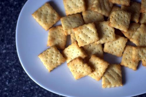 From here, you can either form them into individual crackers and bake them an inch apart on your baking sheet (the method I used) or transfer the entire rolled-out sheet to your baking sheet (draping it over the rolling pin will make it easier) and score them lightly with a knife, pizza or pastry wheel to break into crackers after they are baked. For either method, dock all over with a fork and sprinkle with salt or any other toppings you are using.