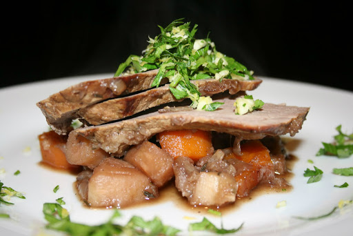 Remove the pan from the oven. Remove the meat from the pan and skim off any excess fat from the surface of the cooking liquid, if need be. Slice the meat in 1/2-inch slices and serve with the veggies and pan juices. Wine Pairing Suggestion: Pinot Noir