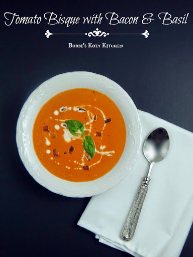 Place bisque in serving bowls; top with the remaining bacon, basil and a drizzle of cream (optional).