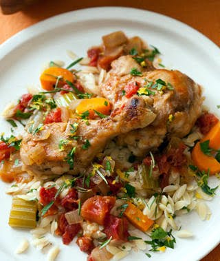 3. Return chicken to pan, cover and bake 30 minutes until chicken is cooked through and tender. Meanwhile, mix gremolata ingredients in small bowl. Sprinkle chicken with gremolata; serve with cooked orzo, if desired.