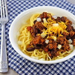 5. Remove from heat; stir in chocolate and salt. Serve chili over spaghetti; top with remaining 1/2 cup onion and cheese.
