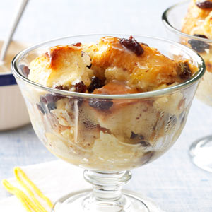 My sister gave me the recipe for this delicious bread pudding that's dotted with raisins. It's a big hit with everyone who's tried it. A homemade vanilla sauce goes together quickly on the stovetop and is yummy drizzled over warm servings of this old-fashioned-tasting treat. —Sherry Nice McComb, Ohio