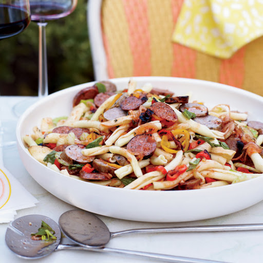Add 1/4 cup of the dressing to the pasta and toss. Add the sausages, peppers, radicchio, celery, mozzarella and the remaining dressing and toss well. Season the pasta salad with salt and pepper, sprinkle with the basil and serve.