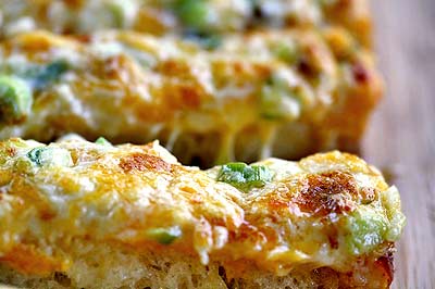 Preheat broiler. Slice loaf of bread in half horizontally, lay crust side down. Spread cheese mixture over bread.