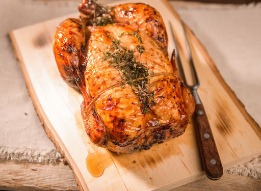 While the grill is preheating, remove the chicken from the brine and pat it dry. Rub it with the garlic, onion powder, salt and pepper. Next stuff it with the lemon, onion, garlic, and thyme. Tie the legs together. Place it on the grill and let it smoke for 2 ½ to 3 hours. The chicken is done when it reaches an internal temperature of 160 degrees. Let it rest 15 to 20 minutes before carving.