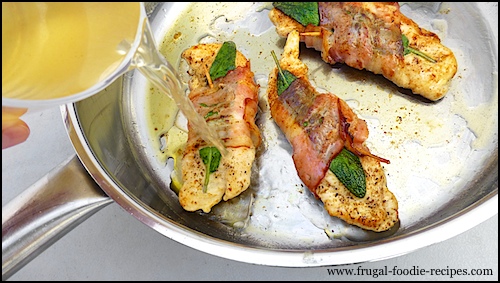* *Remove* toothpicks from the cutlets, slice into spirals, plate and *drizzle* the reduced cooking liquid over the chicken and serve immediately.