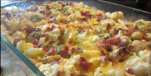 In a large bowl combine sour cream, mayo, 1/2 of crumbled bacon, 3 tbs chives, 1 cups of cheese,mushrooms(optional) and cauliflower and mix well... place in baking dish and cover with remaining 1 cup of cheese and rest of bacon crumbles. Bake for 15-20 minutes until cheese is melted. top with remaining 3 T chives and serve.