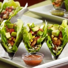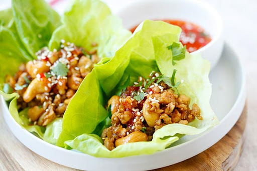 To assemble the lettuce wraps, add 1 tablespoon of the filling onto the middle of the butter lettuce, and top with some sauce. Wrap it up and eat immediately.
