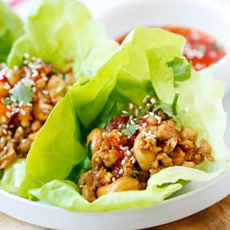 Thai Chicken Lettuce Wraps are full of flavors and a healthy dinner. The chicken is browned with onion and garlic, then simmered in seasonings. Put a little on a lettuce leaf with some sauce and enjoy!