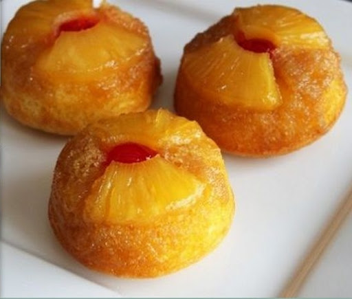 3. In small bowl, stir together melted butter and brown sugar. Spoon 1 1/2 teaspoons butter mixture into each muffin cup. Top each with 2 pineapple pieces. Place cherry half, cut side up, in center of pineapple pieces. Spoon 1/4 cup batter into each cup.