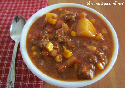 In a large pot, brown and crumble ground beef along with diced onions over medium heat.