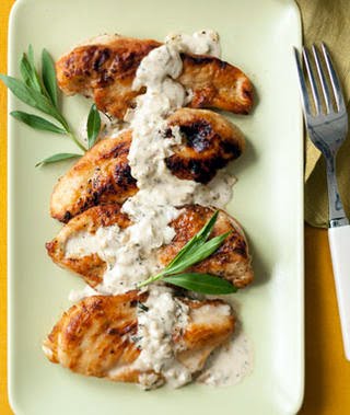 This flour-coated chicken gets browned to a delicate crisp before it’s bathed in a silky combination of dry white wine, heavy cream, chopped shallots, dried tarragon and Dijon mustard.