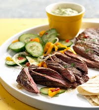 3. Prepare grill for direct cooking over high heat (about 500 degrees F). (See "direct grilling," below). Grill steaks over direct high heat, with lid closed as much as possible, 4 to 6 minutes for medium-rare, turning once or twice. Remove from grill and let rest for 5 minutes. Slice across the grain in 1/2-inch-thick slices. Serve warm with Avocado Dipping Sauce and Cucumber Salad. Makes 6 servings.