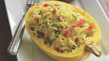 Coat a 13″ x 9″ baking dish and a baking sheet with nonstick spray. Place the squash, cut side down, on the sheet. Bake for 30 minutes, or until tender when pierced with a sharp knife. With a fork, scrape the squash strands into a large bowl.