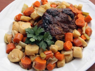 Transfer the roast to a cutting board. Spoon the vegetables and pan juices onto a large serving platter. Slice the roast, arrange the meat on top of the vegetables, and serve family style.