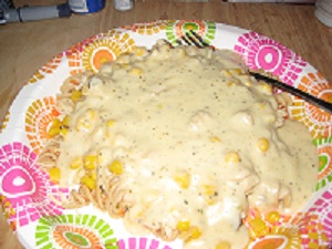When the Noodles are cooked Drain them and place them in a large skillet, add Chopped Chicken, Onion Mushroom, celery and carrot mixture, then add the white sauce and stir well