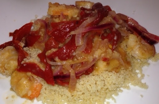 Add sliced Red onion and garlic to same pan. Add couple tbsp of chicken broth if needed to start the simmer. Stir occasionally. Once the onions are slightly limp add remaining chicken broth, vinegar, sugar and lemon juice to deglaze and mix in all of the nice browned bits from browning the shrimp.