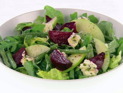 Combine the lettuces in a large bowl. Add the green beans and apple slices and top with the beet wedges. Sprinkle the goat cheese on top. Just before serving, pour the dressing over the salad and toss until coated.