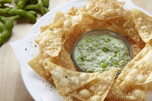 5 Scrape dip into a 2-cup serving bowl. Garnish with reserved edamame beans and sprinkle with toasted sesame seeds. Serve with wonton chips and vegetables for dipping.