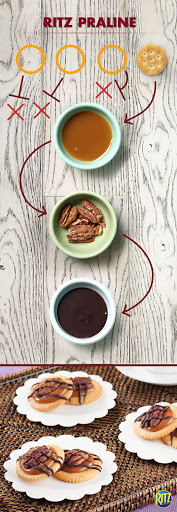 RITZ cracker pralines make a powerful formation of salty and sweet! Microwave caramels and water in bowl until caramels are melted, stirring every 30 seconds. Cool for 5 minutes and arrange crackers on a waxed paper-covered baking sheet. Spoon 1/2 tsp. caramel onto each cracker, top with a pecan, and drizzle chocolate. Refrigerate for 15 minutes or until chocolate is firm.